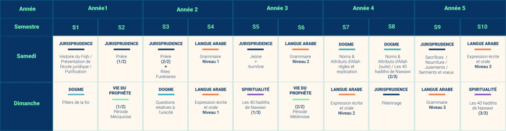 Un parcours complet sur 4 ans, avec un enseignement de l’histoire, de la Jurisprudence Islamique (enseignée selon l’école malikite), du Dogme et de la Spiritualité.
